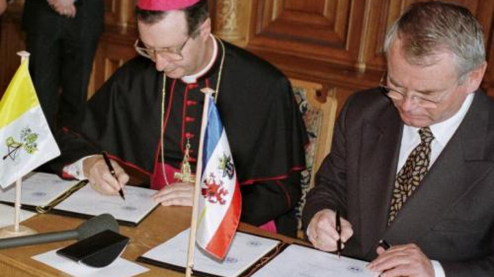 Schwerin (kna). Am 15. September 1997 war es endlich soweit: Der Apostolische Nuntius, Erzbischof Giovanni Lajolo, und Ministerpräsident Berndt Seite (CDU) unterzeichneten in Schwerin einen Staatskirchenvertrag.