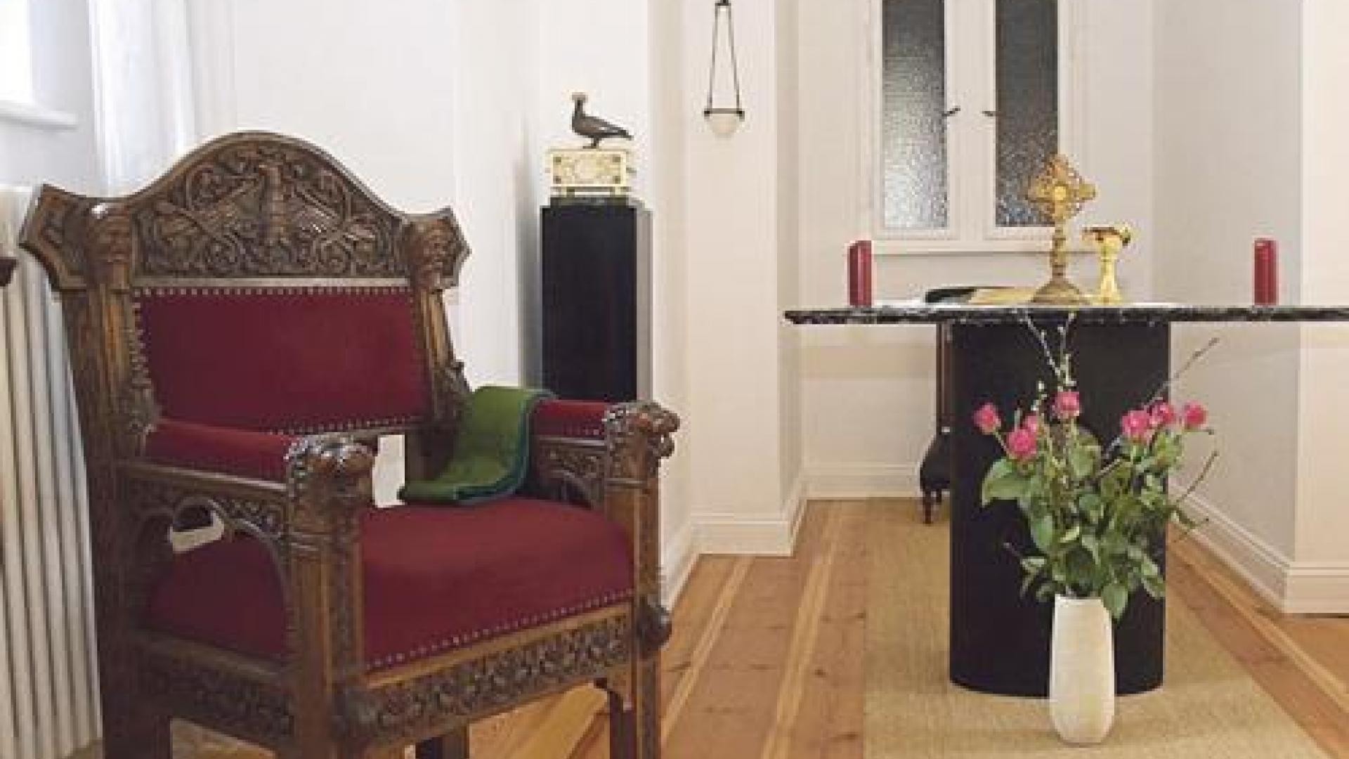 Außerhalb der Wohnung im zweiten Stock geht direkt vom Treppenhaus die kleine Privatkapelle ab; ein länglicher Raum mit einem Fenster in die Kirche an der Stirnseite. Davor ein Kniestuhl zum Beten. Den nutze er oft, sagt der Erzbischof: „Am Abend, wenn es dunkel ist und da unten die Opferlichter brennen, das ist wunderschön.“ In der Mitte der Kapelle steht der kleine Altar, auf dem Altargerät, Messbuch und zwei Kerzen gerade Platz haben. Daneben steht auf einer Marmorstele der winzige weiße Tabernakel mit der großen schwarzen Taube. Feiert er die Messe hier alleine? „Nein, da ist immer das ganze Erzbistum dabei“, entgegnet Koch.