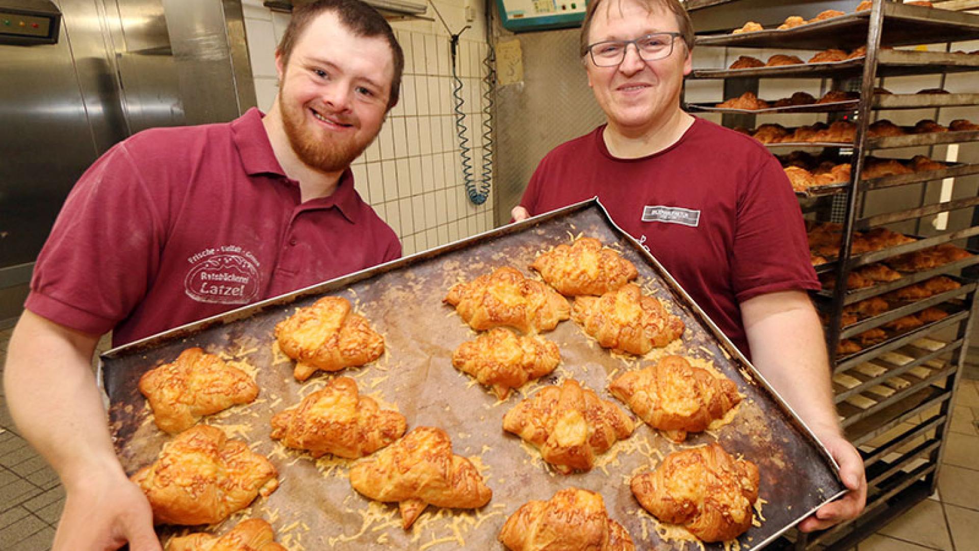 In der Backmanufaktur von Rainer Knorr in Zeven liegt ein verführerischer Duft in der Luft. Zusammen mit Julian Kruse arbeitet der Konditormeister an Schoko-Croissants. Ein letztes Blech soll noch in den Ofen, dann ist Feierabend. „Ich liebe Croissants“, sagt Julian Kruse. Der junge Mann legt die Schokostangen für die Füllung exakt auf den Teig. Sorgfältig faltet und schneidet er die Rohlinge, dann geht es ab in die Hitze. Julian Kruse hat das Down-Syndrom – und arbeitet schon seit einigen Jahren in Zeven bei Bremen als Vollzeitkraft in der Backstube von Rainer Knorr.