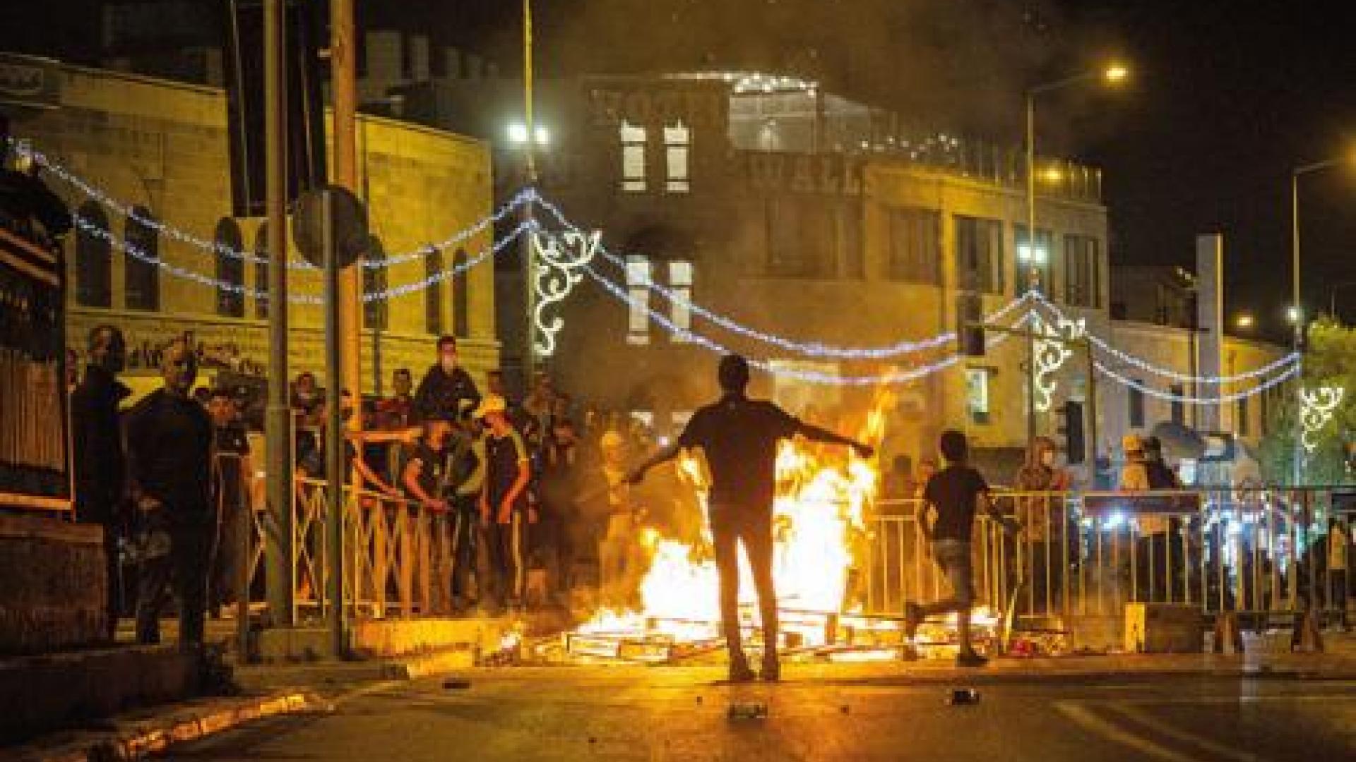 | 8. Mai, am Damaskustor zur Jerusalemer Altstadt: Gewaltsame Zusammenstöße zwischen Palästinensern und der israelischen Polizei. Hinter einer am Boden liegenden Absperrung brennt ein Feuer. Foto: kna |