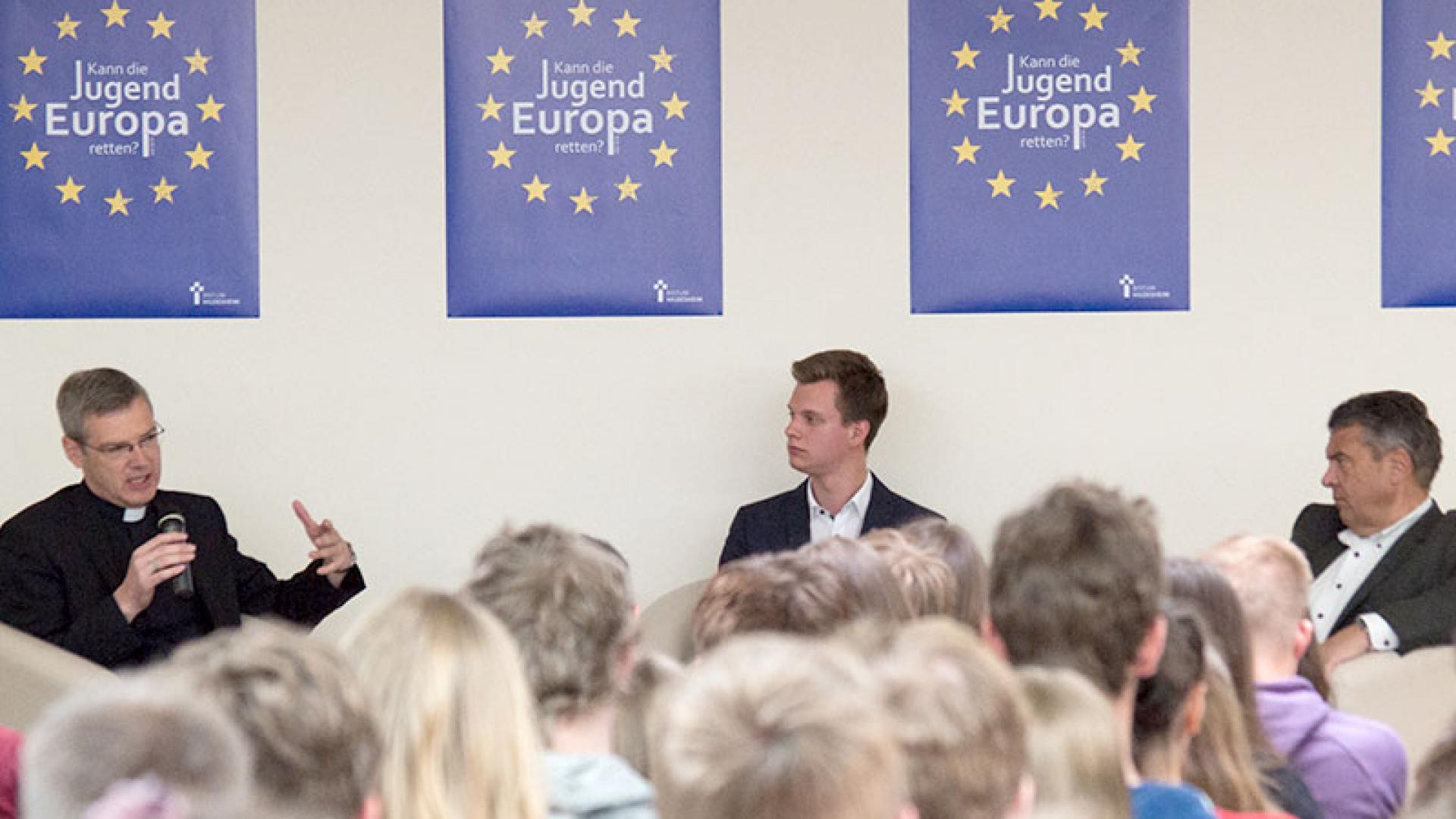 Die Hildesheimer Gruppe von „Pulse of Europe“ und das Bistum Hildesheim hatten Schülerinnen und Schüler der 11. Jahrgangsstufe der Gymnasien Marienschule und Josephinum zu einer Diskussionsrunde eingeladen. Gäste auf dem Podium waren Bischof Dr. Heiner Wilmer und der SPD-Bundestagsabgeordnete Sigmar Gabriel.