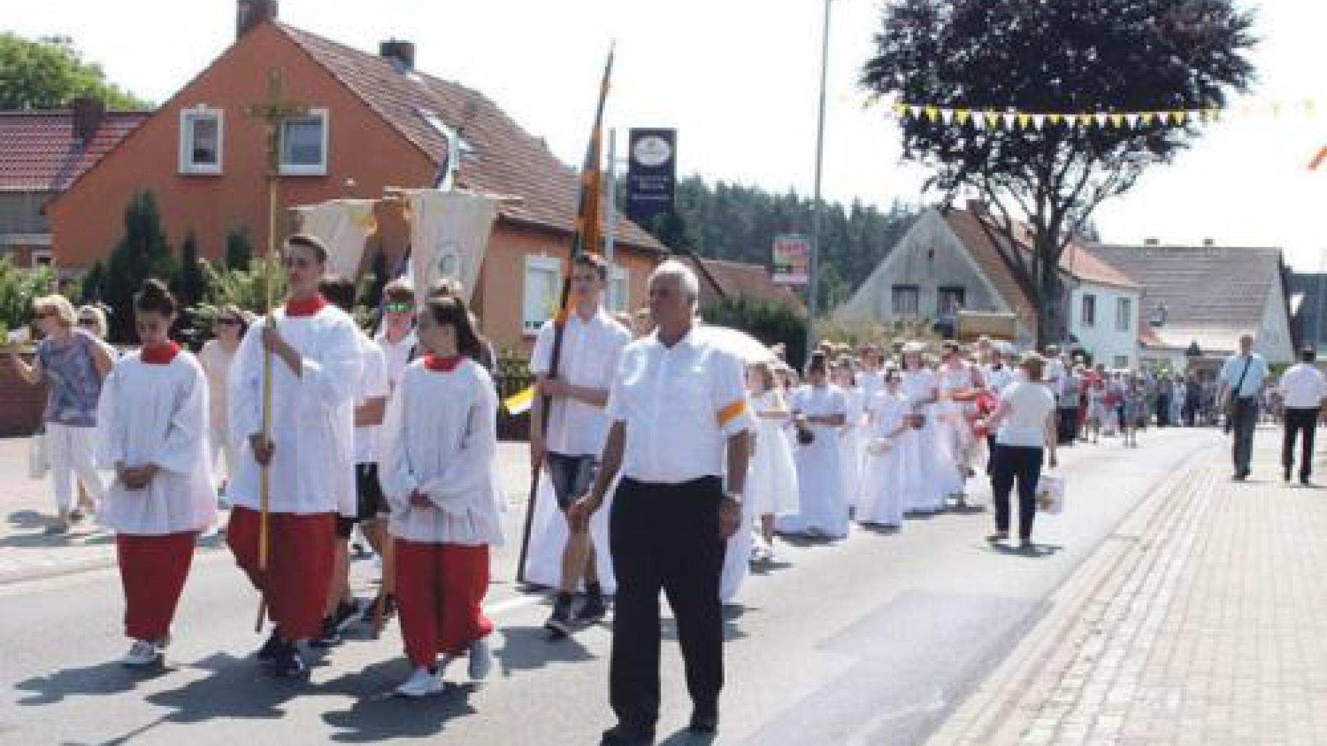 Nach der Messe folgen die Gottesdienstbesucher dem Allerheiligsten als Zentrum ihres Glaubens: Einmal die Dorfstraße hinunter zum letzten Hof, auf dem der erste Altar aufgebaut ist. Felix läuft jetzt schon das Wasser von der Stirn, dennoch wird kräftig geläutet und Timo geht stolz weiter vorne in der Gruppe der Erstkommunionkinder seinen Weg. Die Kinder haben Durst. Schatten durch große Bäume gibt es in Hoppenwalde nicht. Damit niemand von den Ministranten, Fahnenträgern und Erstkommunionkindern umkippt, wurde der Kinderwagen als Wasserprovianttransporter zweckentfremdet. Das Baby schläft friedlich in der Trage. An den Altären kommen alle zur Ruhe, beten gemeinsam das Allerheiligste an. Drei Altäre weiter kommt die Prozession wieder auf der Wiese hinter dem Pfarrhaus an. Leichte Wolken bedecken kurz die Sonne. Noch einmal wird angebetet, bevor das Allerheiligste mit dem Gesang von „Großer Gott, wir loben dich“ in die Kirche Mariä Himmelfahrt gebracht wird, wo derzeit das Lichtkreuz aus St. Hedwig hängt.