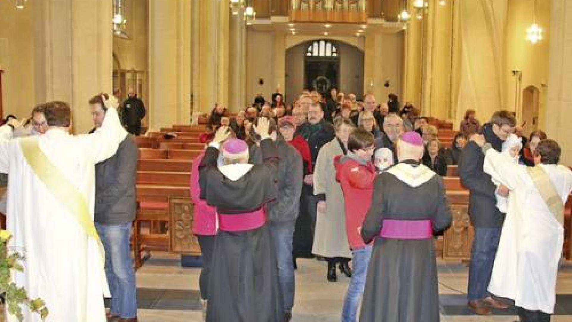 | Bischof Gerhard Feige, Bischof emeritus Leo Nowak sowie die Diakone Christoph Tekaath und Bernhard Neumann segnen die Paare und anderen Gottesdienstteilnehmer in der Kathedrale St. Sebastian in Magdeburg. | Foto: Susanne Sperling |