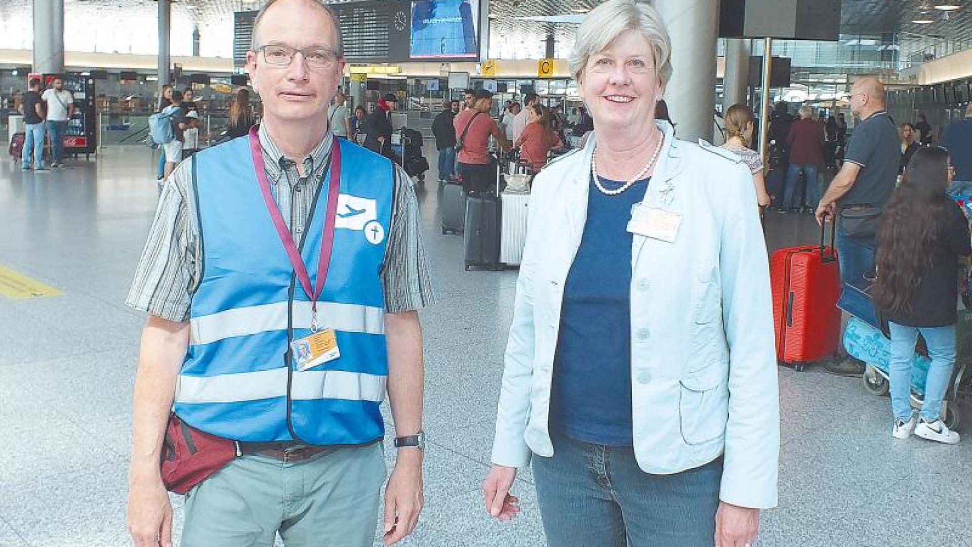 „Wo solls hingehen“, fragt Karl-Martin Harms ein Ehepaar in der Schlange. „Nach Istanbul und von da weiter nach Südafrika“, erklärt die Frau. Harms ist evangelischer Flughafenpastor und in seiner Funktion schnell erkennbar: Er trägt eine blaue Weste mit einem Emblem, das ein Flugzeug und ein Kreuz zeigt. Er überreicht den beiden ein kleines Heftchen mit einem Reisesegen in verschiedenen Sprachen. Das Ehepaar freut sich über die guten Wünsche vor der langen Reise.