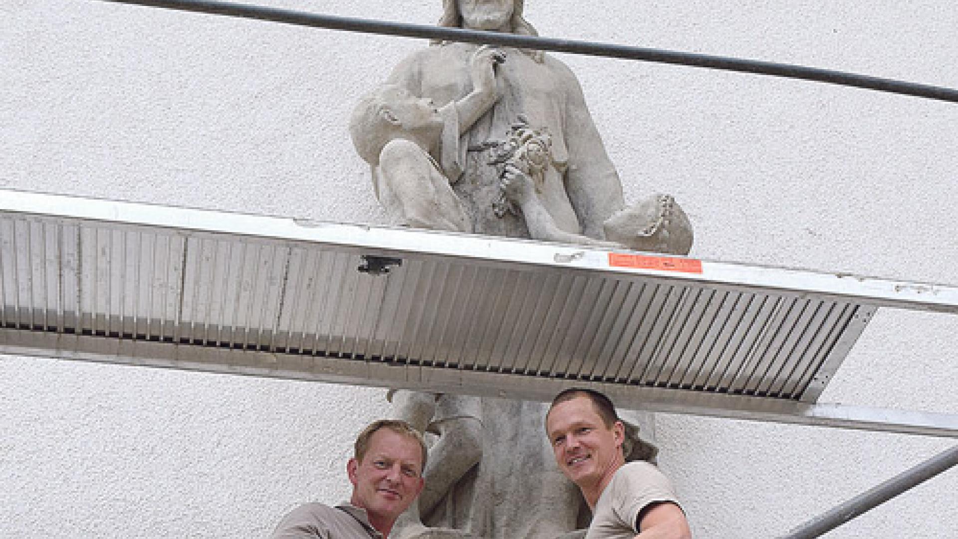 Als Robert Thor von der in die Jahre gekommenen und sanierungsbedürftigen Skulptur erfuhr, war für ihn sofort klar, das Werk seines Urgroßvaters auf eigene Kosten in einstigem Glanz erstrahlen zu lassen. „Das muss eine seiner ersten Arbeiten gewesen sein. Die will ich unbedingt sichern.“ Zunächst wurde die mit schwarzer Patina, Moos und Verkrustungen besetzte Oberfläche abgestrahlt. Besonders schlimm gelitten hatte das rechte Bein des Jungen, an dem der rostende Bewehrungsstab offen lag. Es hatte gar den Anschein, als würde das Bein bluten. Bei der „Notoperation“ konnte sich der Steinmetzmeister in vierter Generation auf seinen Mitarbeiter, Steinmetz Andreas Jönsson aus Kirchheilingen, verlassen.