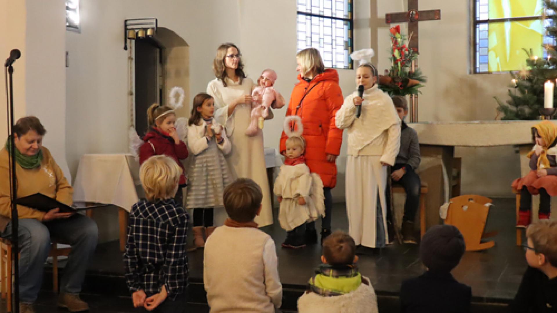 Die Einladung hatte sich gelohnt: Die jüngste Darstellerin – ein Schaf – war ein zweijähriges Kleinkind, die Rolle der Erzählerin übernahm Regina Bretterbauer (72). Susanne Nomine schaute, welches Krippenspiel sich eignet und wer welche Rolle übernehmen konnte. Neu war allerdings, dass sich zwei Kinder fanden, die die Maria spielen wollten. Auch für den Josef begeisterten sich zwei Jungen. „Das hatten wir noch nie, eigentlich sind beide Rollen nicht so leicht zu besetzen“, betont Susanne Nomine. Unterstützt wurden die kleinen und großen Darsteller von einer musikalischen Familie der Gemeinde.