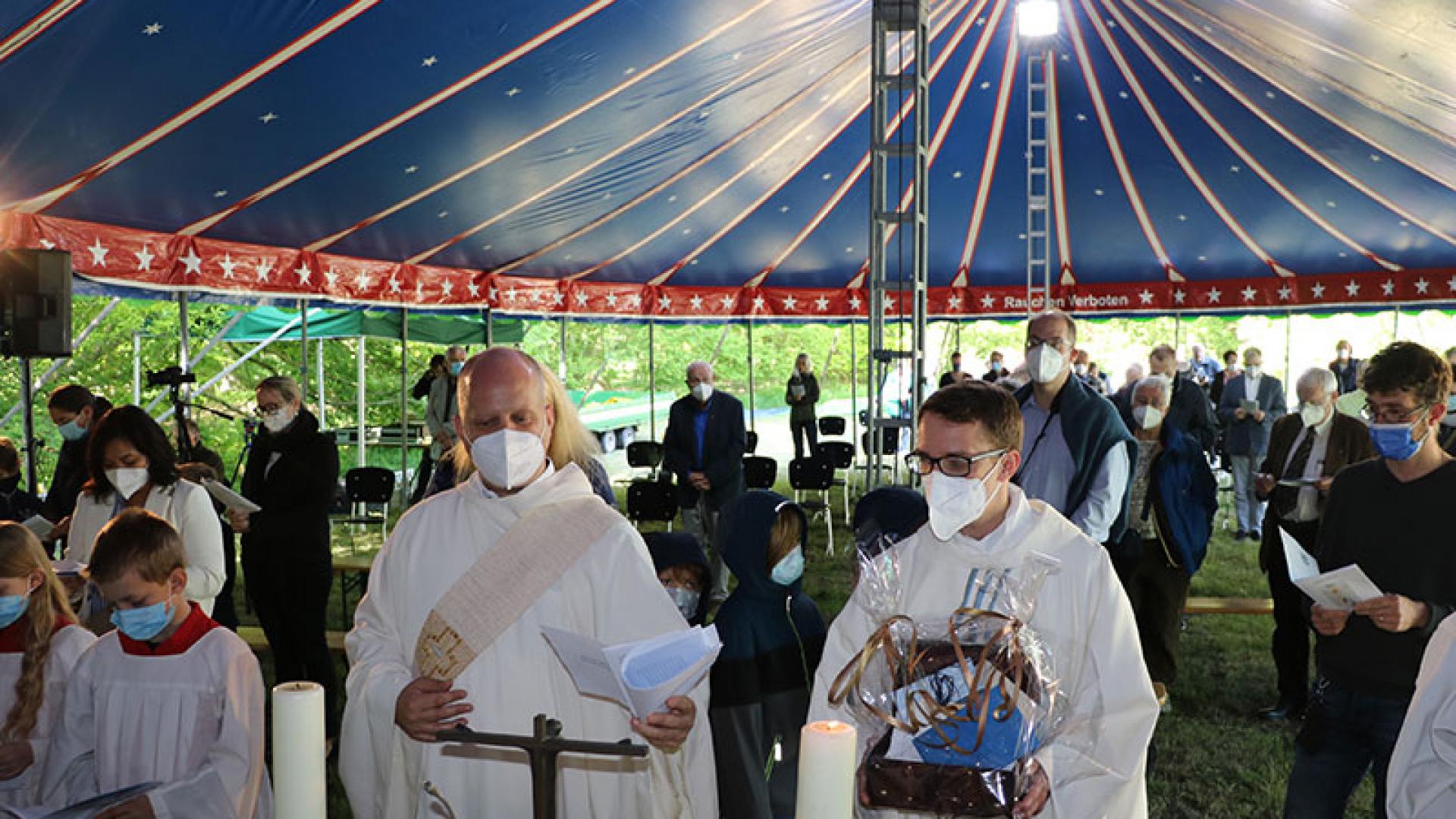 Das Dekanat Bremerhaven feierte den Pfingstsamstag frisch geweihten Priester Christian Gawel, der schon knapp zwei Jahre in Bremerhaven lebt und arbeitet und als Kaplan noch ein weiteres Jahr vor Ort bleiben wird. Nachdem die Priesterweihe im Dom coronabedingt in kleinem Rahmen stattfinden musste, hatte sich das Team der Bremerhavener Pfarreien für die Primiz ihres Jungpriesters etwas Besonderes ausgedacht. Damit möglichst viele Menschen gemeinsam mit dem 30-Jährigen feiern konnten, wurde kurzerhand ein Zirkuszelt ohne Seitenteile aufgebaut. Erprobt hatten die Bremerhavener das bereits im vergangenen Sommer bei einem Begegnungstag der Gemeinden.