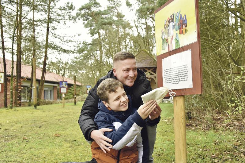 Der zwölfjährige Mark hat sichtlich Spaß, nach dem kleinen Stoffsack zu greifen, der unter einem in leuchtendem Gelb gehaltenen Bild hängt. Das Bild zeigt den auferstandenen Jesus im Kreise seiner Freunde, wie ein darunter angebrachter kurzer Text in einfacher Sprache erzählt. Doch vor allem der Stoffsack, in dem sich ein hölzernes Herz – Symbol der Liebe Gottes – ertasten lässt, interessiert Mark. Dann ist seine Aufmerksamkeit schon wieder ganz woanders. Er will andere Teile des Geländes erkunden und ein bisschen toben. Mark ist ein aufgeweckter Junge, doch sein Autismus hindert ihn, sich allzu lange auf etwas zu konzentrieren. Doch bis Ostern ist es ja noch ein paar Tage hin und vielleicht wird der Junge bis dahin ja auch noch die anderen zehn Kreuzwegstationen in Augenschein nehmen und ertasten, was es zu entdecken gibt: einen Palmzweig etwa, Symbol für den Einzug Jesu in Jerusalem, oder ein Stück Brot als Symbol für das letzte Abendmahl. Oder die Playmobilfiguren, die für die Soldaten stehen, die Jesus abführen. Und natürlich das Kreuz.