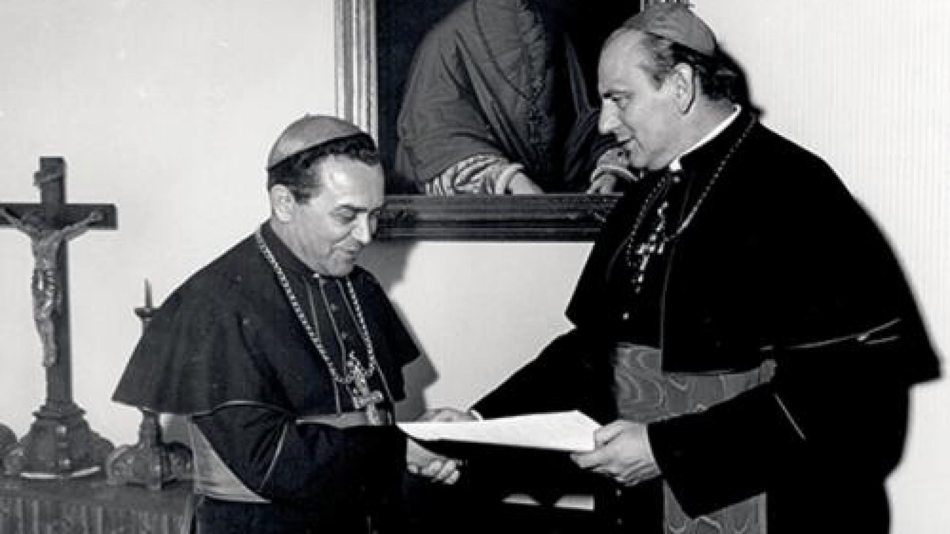 | Am 4. Oktober 1972 überreicht Kardinal Alfred Bengsch dem Apostolischen Administrator Bischof Bernhard Huhn das Dekret über die Errichtung der Administratur Görlitz. Es ist auf den 28. Juni des gleichen Jahres datiert. Foto: Bistumsarchiv Goerlitz |