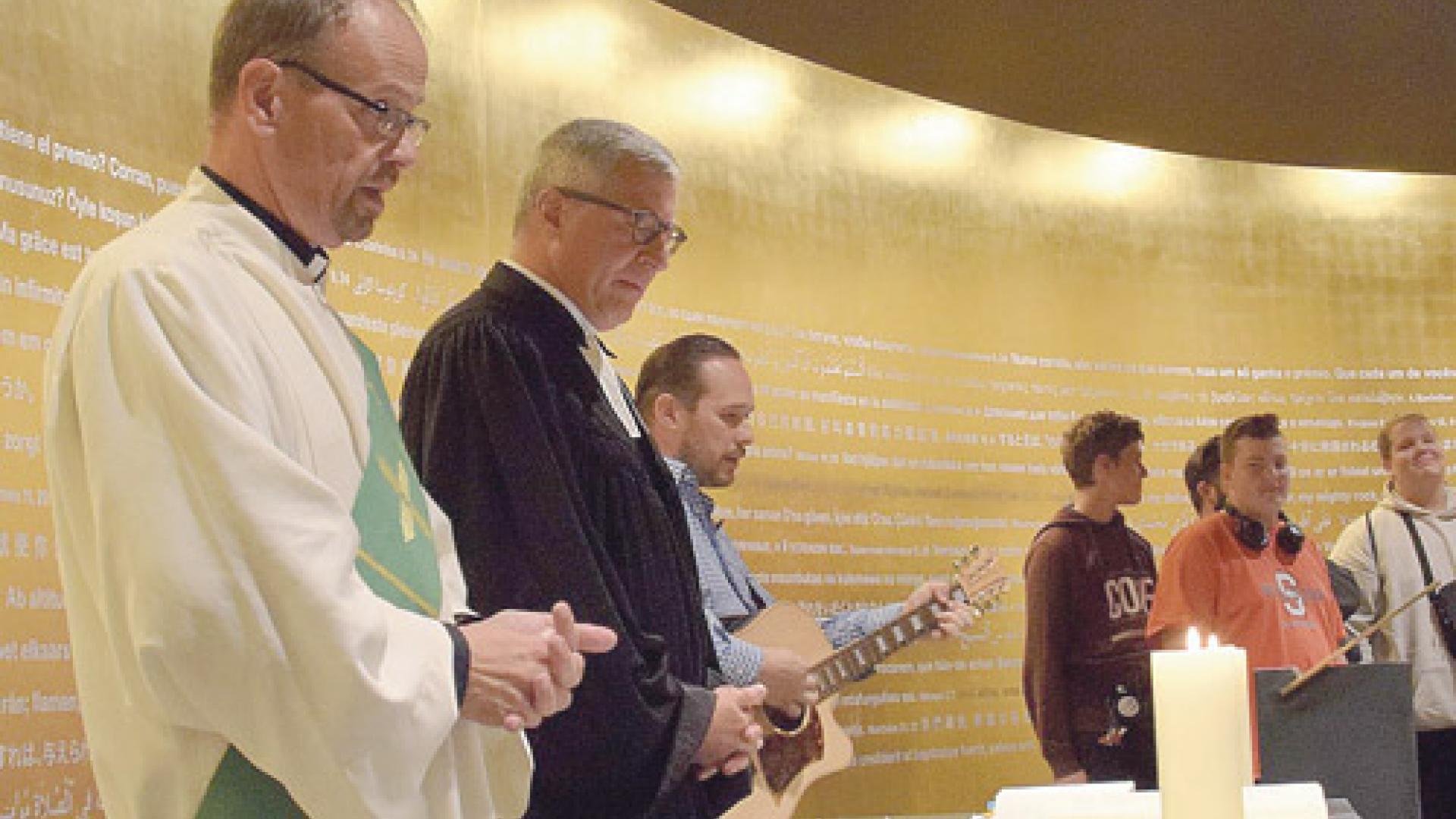 | Mehr als Pro-Forma-Ökumene: Diakon Gregor Bellin und sein evangelischer Kollege Pastor Bernhard Felmberg am Altar im Stadion. Foto: Cornelia Klaebe |