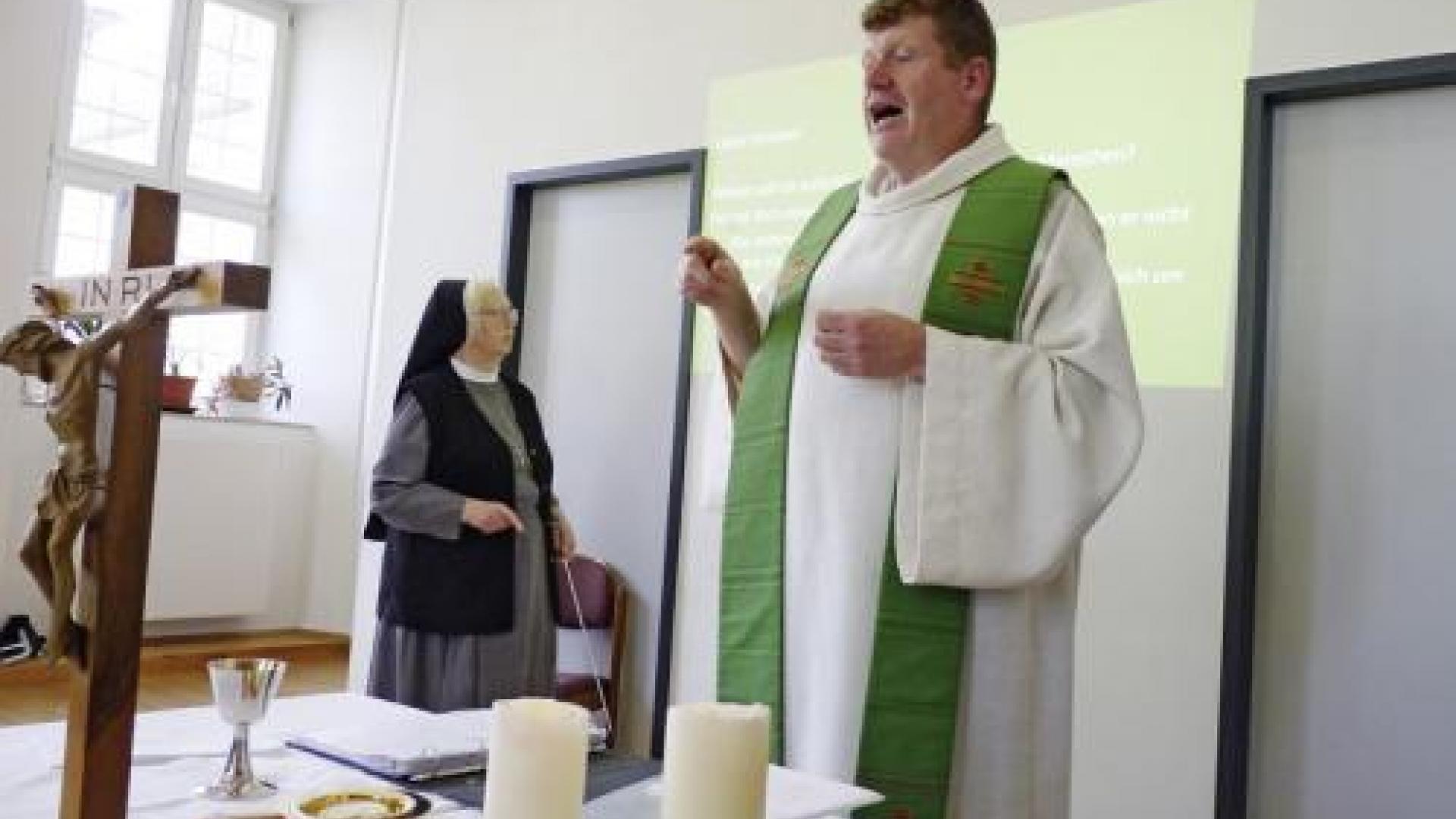 Gesungen wird nicht, aber gebetet. Schwester Bernarde zeigt mit einem Lesestab an, welches Wort an der Reihe ist. Und Matthias Köster nutzt die lautbegleitende Gebärdensprache: Er redet und spricht zugleich in Gebärden. Zur Sicherheit hat er einen schmalen Ordner auf dem Altar liegen. „Wenn ich einmal nicht mehr weiterweiß, dann schaue ich kurz nach unten, welche Gebärde die richtige ist“, sagt er.