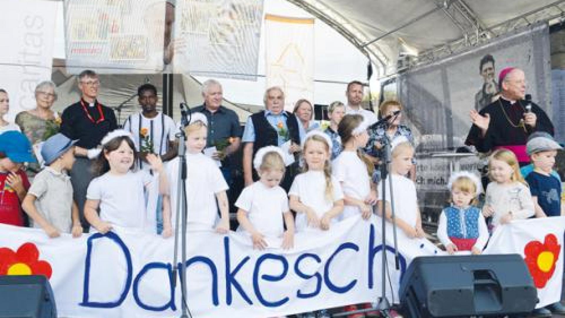 „Wir danken Gott für das Geschenk der Freiheit für unser Bistum und für unser Land“, betonte Bischof Ulrich Neymeyr in seiner Predigt zur Bistumswallfahrt am 15. September in Erfurt. Daraus ergebe sich der Auftrag, diese Freiheit im Miteinander zu gestalten. Weiter betonte er im Bühnenprogramm, dass es keinerlei Grund gäbe, auf die Menschen im Osten herabzusehen. In Gesellschaft und in der Kirche sei vieles geleistet worden. „Ich bin jetzt fünf Jahre Bischof und habe erfahren, wieviel selbstständiges Leben in den Kirchorten und Pfarreien gewachsen ist. Das ermutigt mich, den Pfarrern, Gemeindereferentinnen und Diakonen zu sagen, lasst die Leute ihre Möglichkeiten entdecken, damit Kirche lebt.“