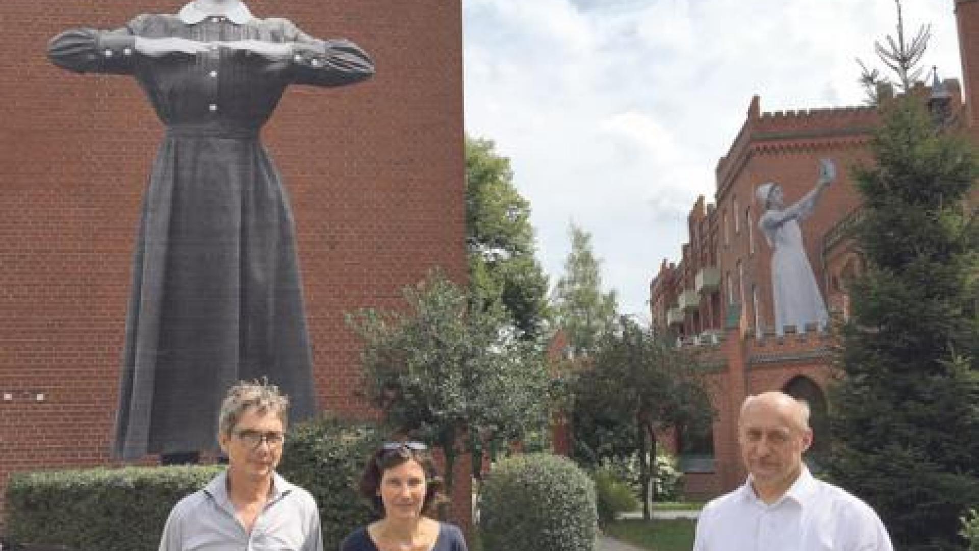 | Das Künstler-Ehepaar David Mannstein und Maria Vill mit Pfarrer Harry Karcz (rechts) vor den beiden Postern in der Klosteranlage Zum Guten Hirten. Fotos: Marie Wildermann |