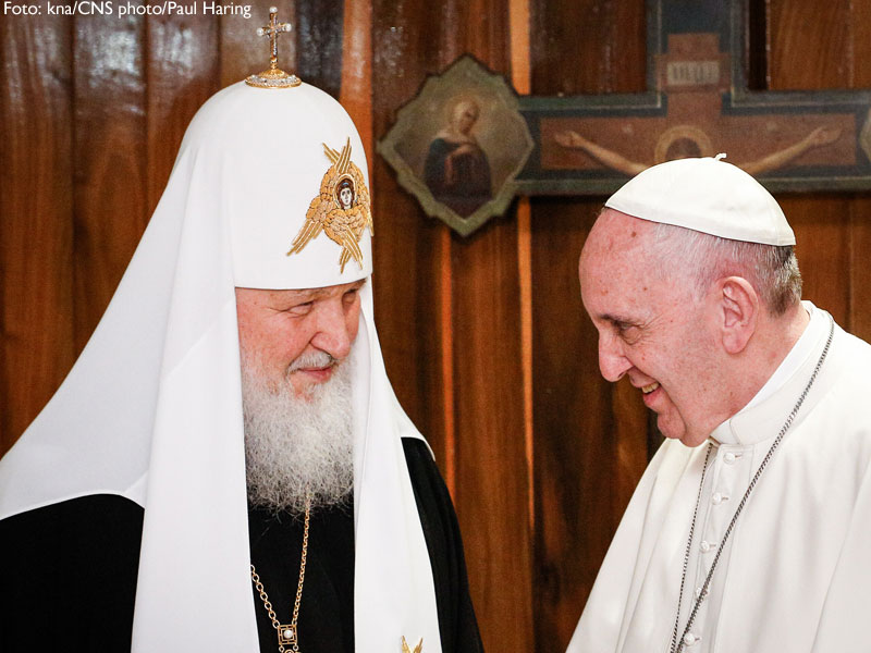 Der Moskauer Patriarch der russisch-orthodoxen Kirche, Kyrill I., fordert die Konfliktparteien des Ukraine-Kriegs auf, Opfer zu vermeiden. Doch er steht weiterhin zu Putin und erkennt die Unabhängigkeit der Ukraine nicht an.