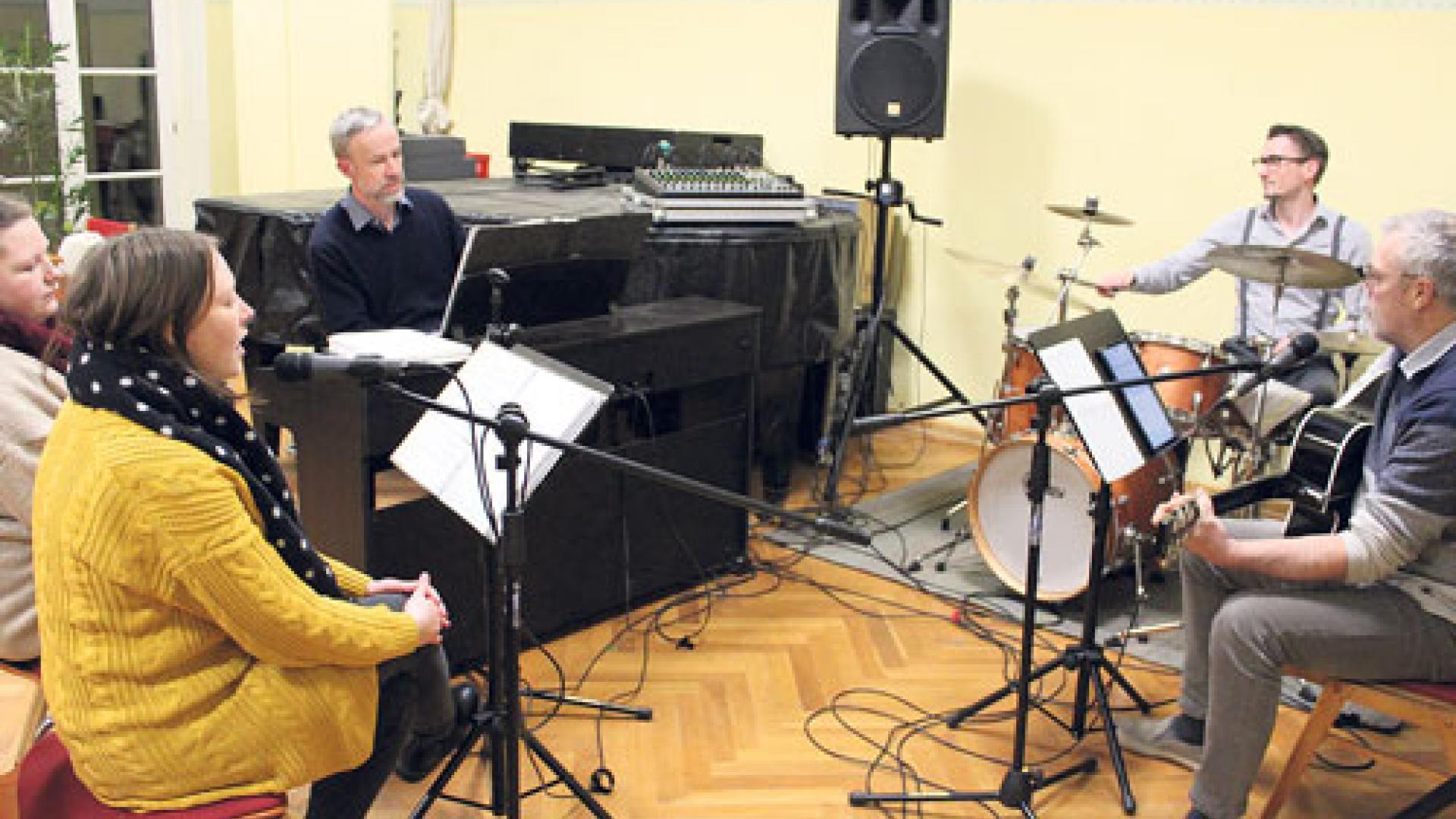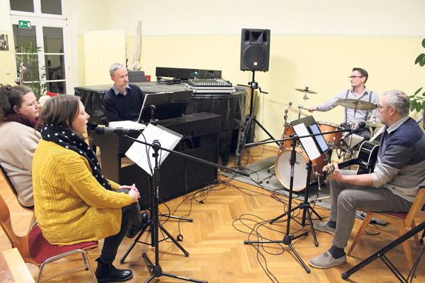 | „Norbeat“ bei der Probe im Pfarrhaus von St. Norbert. Am Klavier: Bandleader Peter Albrecht. Foto: Oliver Gierens |