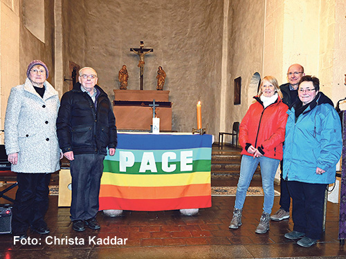 Anlass für die Gebete war vor 20 Jahren der bevorstehende Irak-Krieg. Den konnte die Friedensgebets-Initiative in Mittelheim, einem Ortsteil von Oes-trich-Winkel, nicht verhindern. Doch seitdem kommen Menschen in der Basilika St. Ägidius regelmäßig zusammen zum Beten und Singen. Auch wenn der Initiator schon vor fast 15 Jahren gestorben ist, trägt eine Gruppe ehrenamtlich Engagierter sein Anliegen ohne priesterliche Begleitung weiter – nicht mehr jeden Montag, wie in den ersten Jahren, aber an jedem ersten Montag im Monat. Am Altar wird dazu stets die Fahne der internationalen Friedensbewegung in Regenbogenfarben mit dem Aufdruck „Pace“ angebracht – dem italienischen Wort für Frieden.