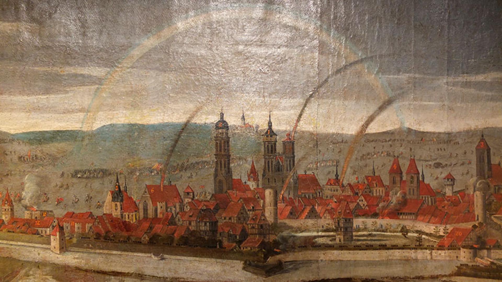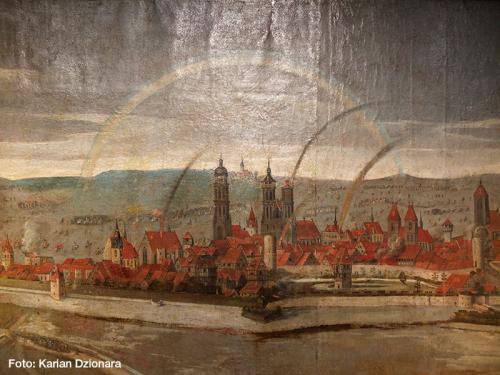Aus den Kirchen der Stadt räumte man die Bilder und die Heiligen, die Bildschnitzer fanden kaum noch Arbeit, die Klöster wurden aufgelöst und umgenutzt, Machtkonstellationen veränderten sich. Eine Epoche im Umbruch. Zwei riesige Wandbilder erinnern an die Belagerungen, Niederlagen und Siege der Stadt im Dreißigjährigen Krieg – ein frühes Mahnmal für den Frieden. „Diese Werke hat der Rat der Stadt in Auftrag gegeben“, sagt Rechenberg, „vieles spricht dafür, dass man damals schon die Erinnerung an die Schrecken dieses furchtbares Krieges wachhalten wollte.“