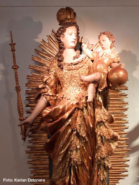 Selbstbewusst präsentiert sie das Jesuskind, es trägt ein Hemdchen, das ebenfalls eher einem Panzer gleicht, und es hält die Weltkugel in der Hand. Ein „apokalyptisches Weib“, von Sonnenstrahlen umgeben und auf der Mondsichel stehend, dieses Motiv geht auf die biblische Offenbarung des Johannes zurück und findet sich in zahlreichen Darstellungen. „Man sieht es ganz deutlich: Diese Maria ist eine Kämpferin für ihren Glauben“, erläutert die Museumsleiterin.