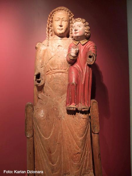 Im Städtischen Museum Göttingen sind 26 Marienfiguren aus sechs Jahrhunderten zu sehen. Glanzvoller Star unter den Madonnen ist die monumentale „Madonna im Strahlenkranz“ aus dem Zisterzienserinnenkloster Teistungenburg im thüringischen Eichsfeld. Museumsleiterin Andrea Rechenberg weiß, dass diese golden schimmernde überlebensgroße Skulptur sofort die Blicke auf sich zieht. „Diese Marienfigur ist unser beeindruckendstes Objekt.“