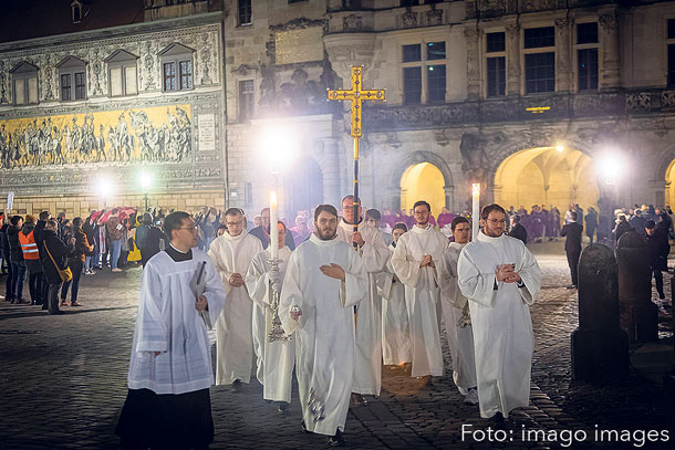 | Vorbei am berühmten Wandmosaik „Dresdner Fürstenzug“ bewegt sich der Zug der Minis- tranten und Bischöfe zum Eröffnungsgottesdienst. Foto: imago images |
