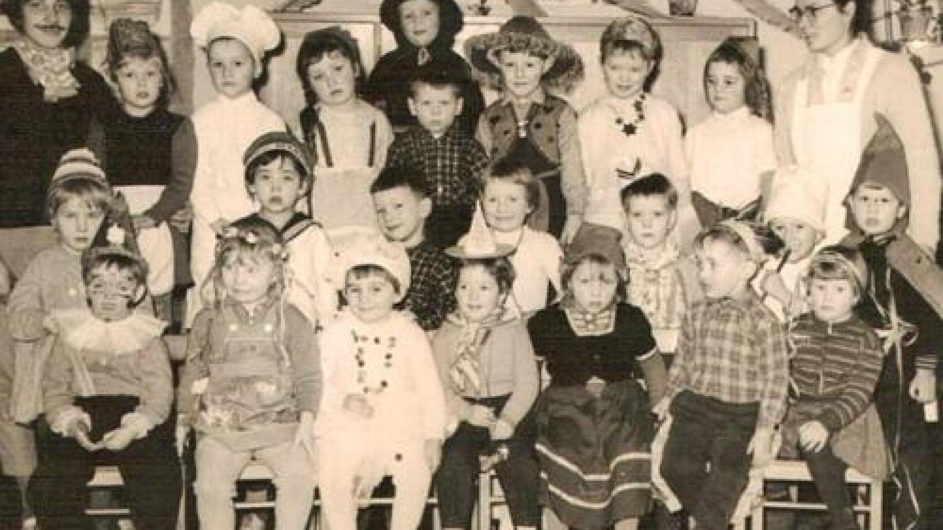 | Kinderfasching Mitte der 1960er Jahre im Kindergarten der St.-Gertrud-Gemeinde in Eisleben, rechts hinten vermutlich Marienschwester Theresgardis in Zivil. Foto: privat |