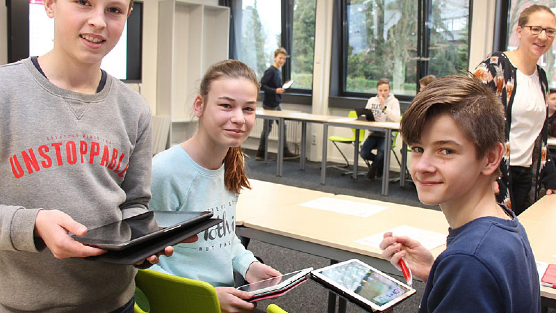 Franz Albers schaut in die Runde. „Seid ihr alle mit den Aufgaben klargekommen?“, fragt der Lehrer. Seine Schüler aus der Klasse 7 am Meppener Gymnasium Marianum kontrollieren ihre Lösungen aber nicht im Heft oder an der Tafel, sondern in ihren Tablets. Seit wenigen Tagen arbeiten alle 146 Jungen und Mädchen der Jahrgangsstufe 7 mit diesen kleinen tragbaren Computern. Genau wie Federmappe und Füller müssen sie die nun jeden Tag in ihren Tornister packen. „Digitale Lernbegleiter“ nennt Franz Albers die Geräte. Denn die Computer sollen die gewohnten Materialien nicht komplett ersetzen, sondern eben nur im Unterricht assistieren. „Unsere Schüler sollen auch weiterhin mit der Hand schreiben. Stift, Heft und Buch bleiben unsere Leitmedien“, sagt er.