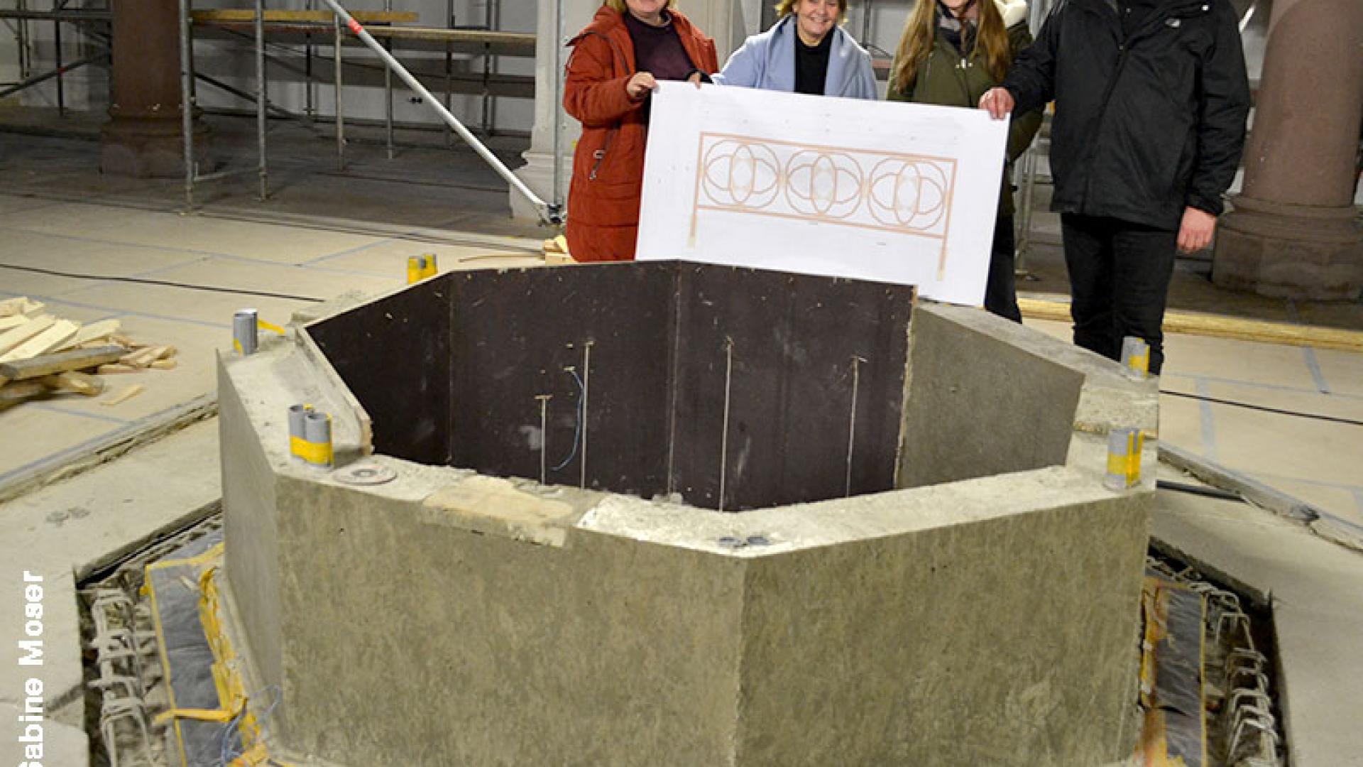 Die Wände im Kirchenraum sind seit Mitte Oktober bis an die Decke eingerüstet, auf dem Altar sind gigantische Baupläne ausgebreitet und im Zentrum des Kirchenschif- fes steht ein großes achteckiges Objekt aus Beton, ganz frisch von seiner Verschalung befreit.