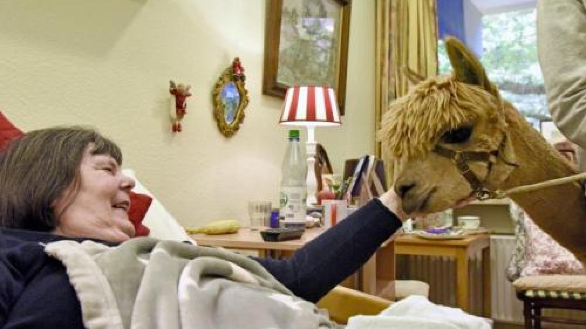 Hühner im Garten, Alpakas im Fahrstuhl und auf Visite bei Bettlägerigen: Das Caritashaus Simeon in Lübeck hatte ein paar nette Gäste zu Besuch.