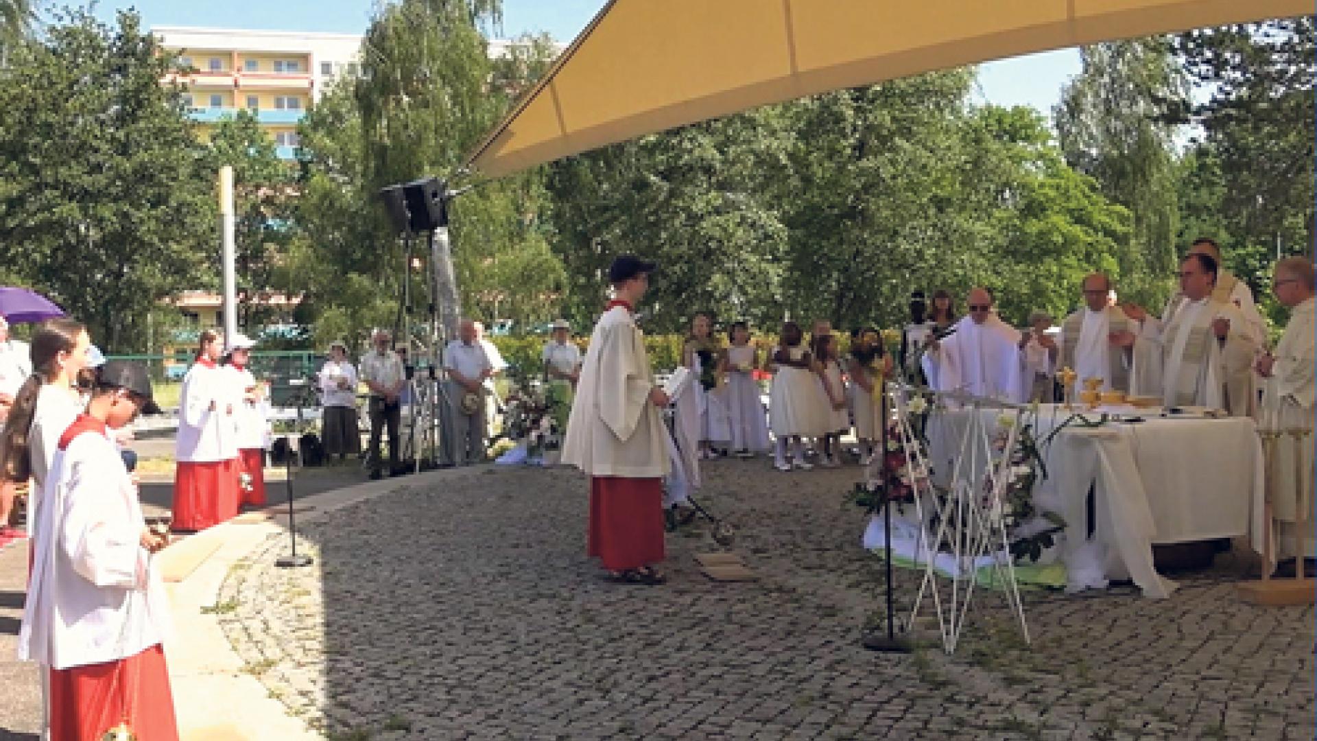 | Gemeinsam mit ihren Glaubensgeschwistern möchten die Chemnitzer Katholiken in der Alltagskultur noch sichtbarer werden, wie hier die Pfarrei Heilige Mutter Teresa bei der diesjährigen Fronleichnamsfeier in der Markersdorfer Oase im Neubaugebiet Fritz Heckert. Foto: Janine Weigel / Koinonia Johannes der Täufer |