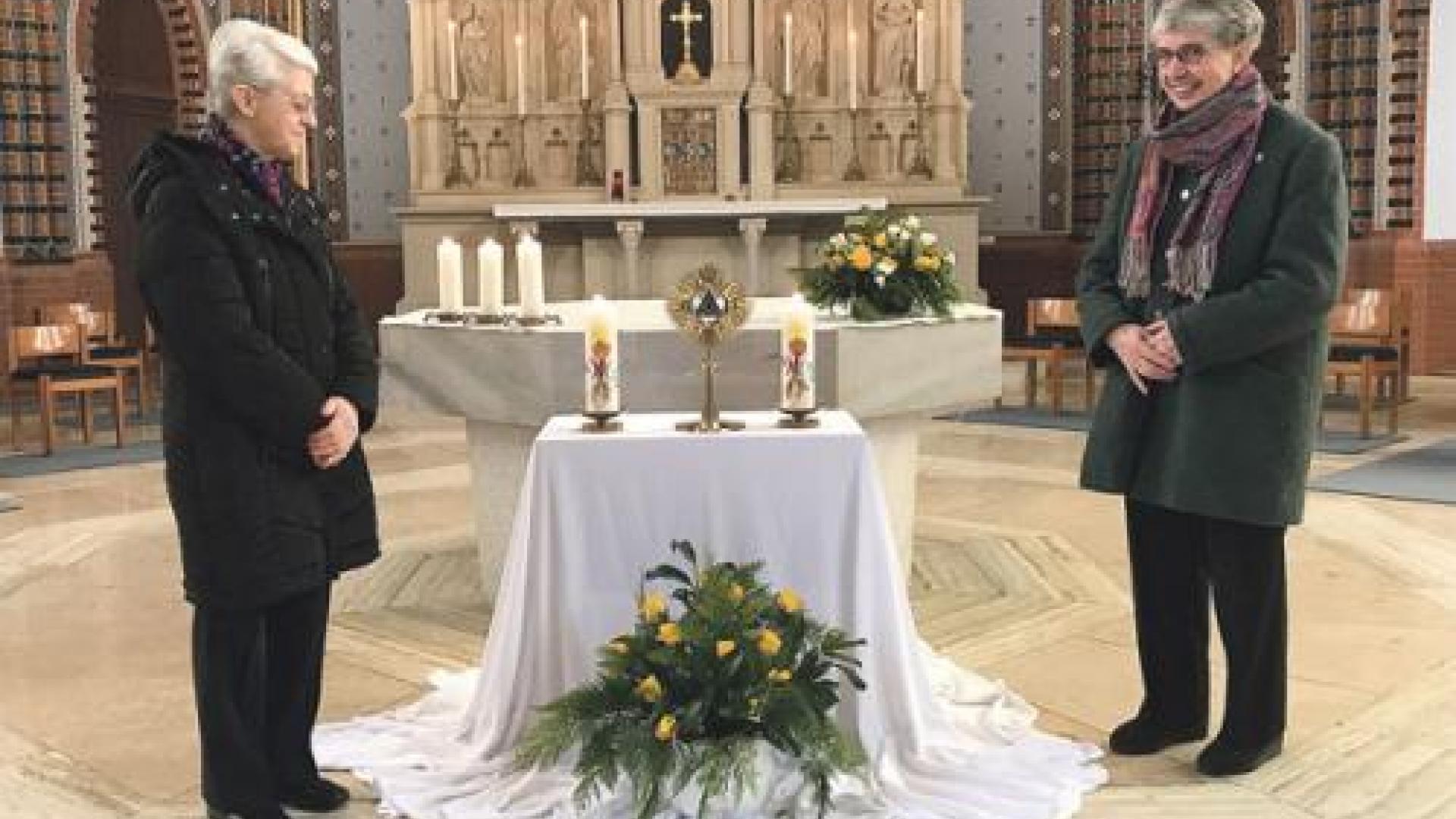 | Die Görlitzer Caritas Socialis-Schwestern Martina Theiner und Maria Zemmer neben der Reliquie der seligen Hildegard Burjan. Fotos: Joachim Rudolph |