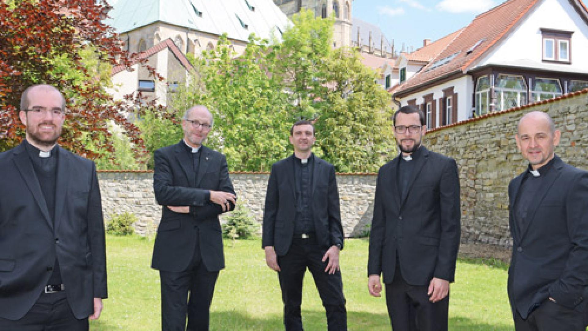 | V.l.n.r.: Die Diakone Maximilian Hofmann, Dr. Jürgen Wolff, Dominik Zyła, David Hilus und Timo Niegsch im Garten des Erfurter Bischofs neben dem Regional-Priesterseminar. Im Hintergrund der Erfurter Dom. Fotos (6): Eckhard Pohl |