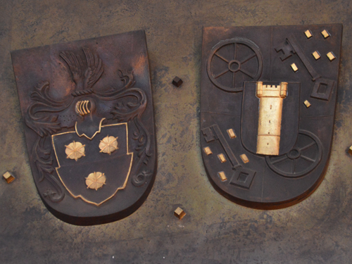 werden. Sein Wappen (links) ließ er auf gleicher Höhe