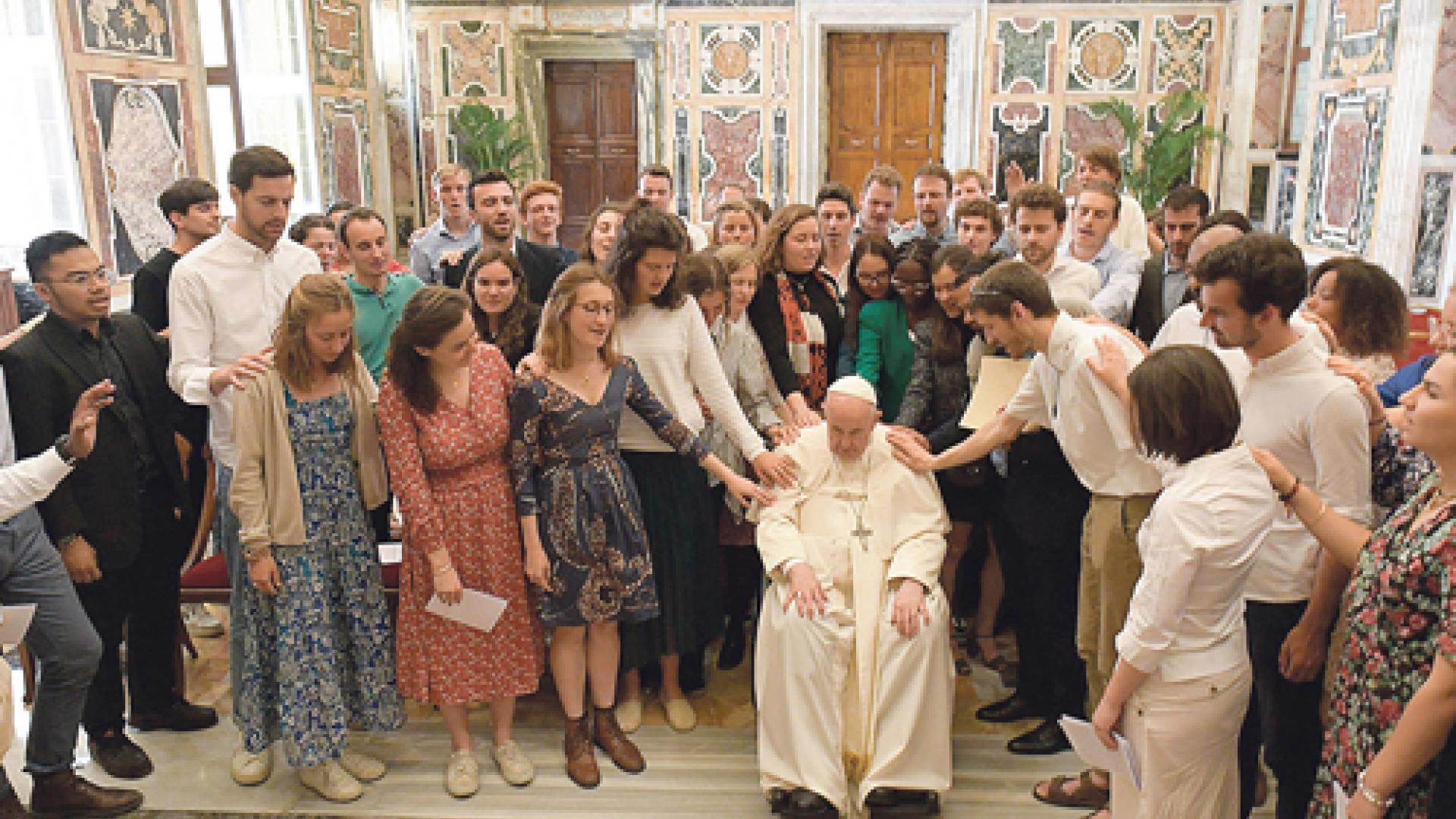 | Zum Abschluss eines Gesprächs über Politik im vergangenen Mai segnen Chemin-Neuf-Mitglieder Papst Franziskus. Foto: imago images/Zuma Press |