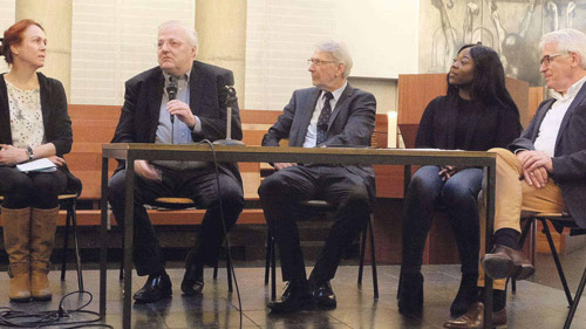 Podiumsgespräch mit Lissy Eichert, Peter Kressin, Reinhard Hempelmann, Tracy Peukert und Erhart Zeiser (von links) im Evangelischen Gemeindezentrum Plötzensee. | Foto: Walter Plümpe