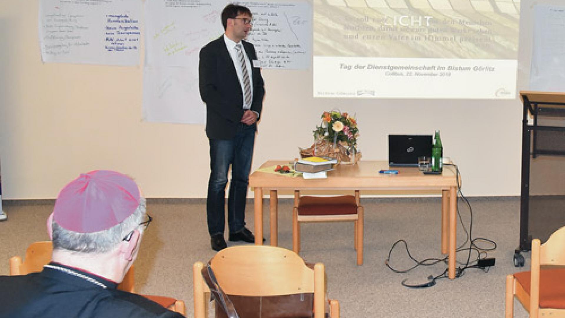 Der Tag begann mit dem Morgenlob in der Propsteikirche nebenan. Nach der Begrüßung und Einführung in den Tag wurde die „Ausgangslage in den katholischen Einrichtungen des Bistums Görlitz“ erörtert. Joachim Baensch, Personalreferent des Bistums, definiert sie so: „In einer ausgeprägten Diasporasituation mit einzelnen lokalen Schwerpunkten kirchlicher Einrichtungen in Trägerschaft von Pfarreien, Caritas und Maltesern wird Vernetzung nicht nur als hilfreich, sondern als ausgesprochen notwendig und bestärkend erfahren. Diesem Anliegen ist der neu ins Leben gerufene ,Tag der Dienstgemeinschaft‘ gewidmet. Es soll, über die teilweise unterschiedlichen Interessenlagen von Einrichtungsleitung und Mitarbeiterschaft hinaus, der gemeinsame Sendungsauftrag aller in einer Einrichtung der katholischen Kirche Tätigen in den Blick genommen werden“, sagte er.