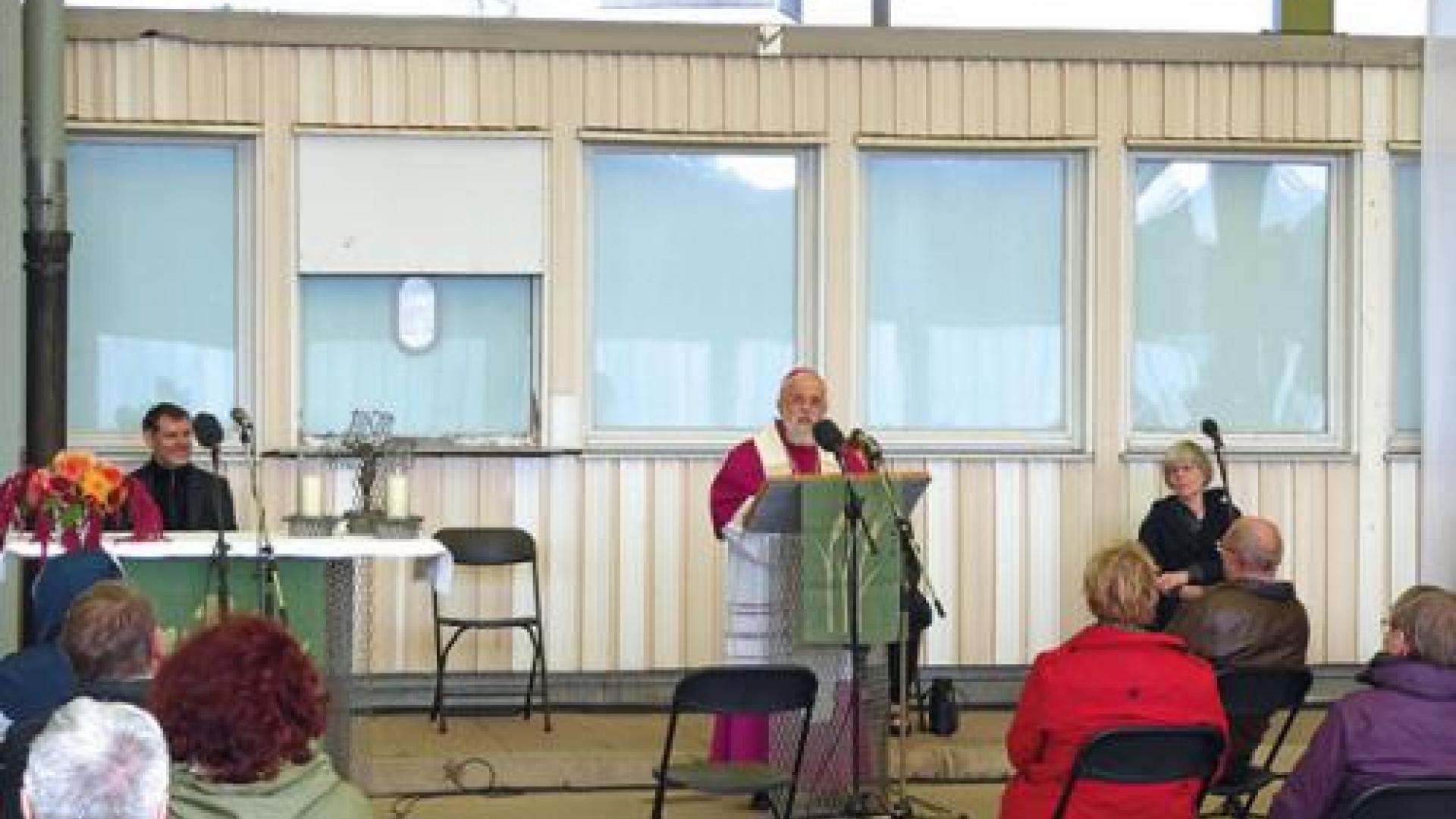 | Bischof Gerhard Feige predigt vor den früheren Grenz- und Zollbaracken am einstigen Grenzübergang Marienborn. Foto: hsp/pbm |