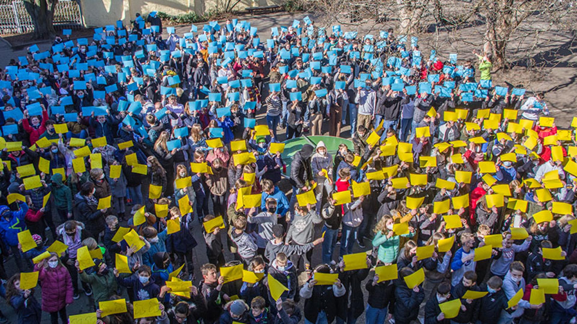 Donnerstag, kurz nach 11 Uhr in der Albertus-Magnus-Realschule (ALMA) treffen sich Schülerinnen und Schüler zum Friedensgebet für die Ukraine. Zu Beginn bilden sie eine lebende Flagge, die Flagge der Ukraine. Auf den gelben und blauen Papieren, die sie hochhalten, sind Friedenstauben abgedruckt. Nach diesem Auftakt hält die Schulgemeinschaft eine kurze Andacht für den Frieden. Dabei beten sie ein ökumenisches Friedensgebet, in dem es heißt: „In welcher Sprache wir dich auch als Fürst des Friedens bekennen, lass unsere Stimmen laut vernehmbar sein gegen Gewalt und gegen Unrecht.“ Zum Ende wird es emotional, es erklingt das Lied „Komm, wir ziehen in den Frieden“ von Udo Lindenberg. Neben vielen nachdenklichen Gesichtern sind auch etliche feuchte Augen bei den Kindern und Jugendlichen, aber auch bei den Lehrkräften zu sehen.