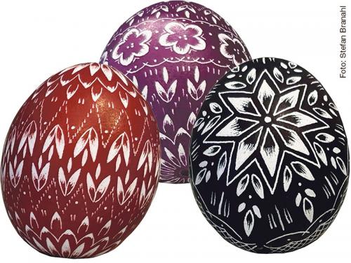 Verzierte Ostereier aus dem Sorbenland sind ein echter Knaller. Aber eine Warnung vorweg: Mal eben auf die Schnelle geht da gar nichts, wer sich daran versuchen will, braucht vor allem Geduld, ein gutes Auge und Fingersptzengefühl. Dagegen ist das Werkzeug eher simpel: Federn, Stecknadel, Löffel, Teelicht, Bleistift, Wachs und Eierfarbe – das wär‘s auch schon.