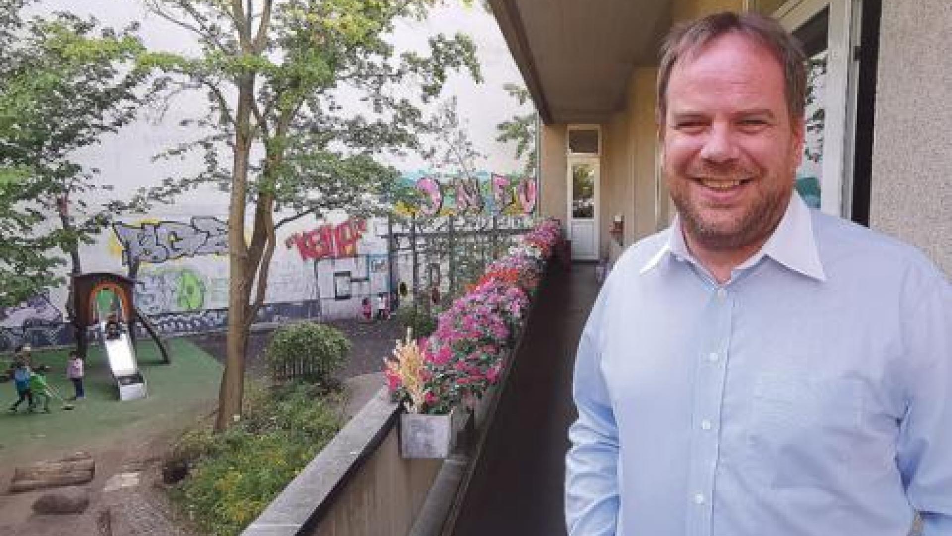 | Benedikt Zimmermann schaut von seinem Büro in den Hof eines Caritas- Kindergartens. Das freut ihn, denn er ist gern mit Menschen unterwegs. Foto: Andreas Kaiser |
